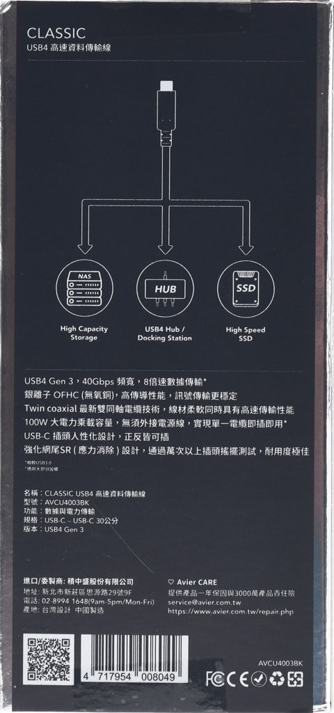 ▼包裝背面有產品名稱、連接應用示意圖、產品特色、產品規格、進口/委製商資訊、Avier CARE保固說明、QR碼、條碼、認證標章
