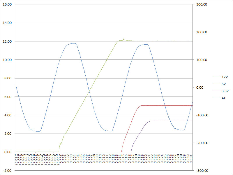 ▼電源PS-ON信號啟動後直接3.3V/15A、5V/15A、12V/52A滿載輸出下各電壓上升時間圖,從12V開始上升處當成起點(0.000s)時,12V上升時間為15ms,5V與3.3V上升時間為5ms