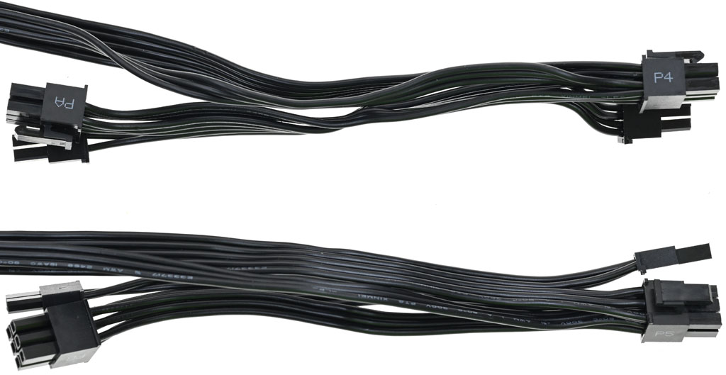 ◆黑色直出線組除ATX 24P外其他採用帶狀線組。具備1個ATX 24P、1個EPS 8P、1個EPS 4+4P、4個PCIE 6+2P、8個直角SATA、2個直式大4P,未提供小4P接頭或轉接線